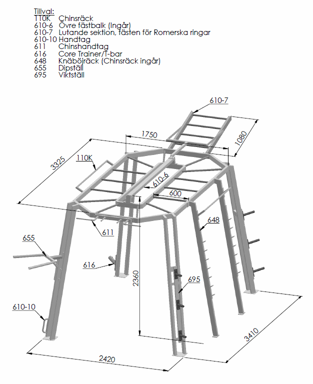 Riggen har mange flotte funksjoner. Den kommer med en monkey bar som går rundt riggen på toppen. Den har en chinsstang på den ene siden og et tilbehørsfeste i midten. Du kan legge til vektholdere på den ene siden, hengende crunch bar, vinklede chins-håndtak og vektstangsholdere. Dette gjør det mulig for flere treningsmedlemmer å trene samtidig og utføre en rekke ulike øvelser.